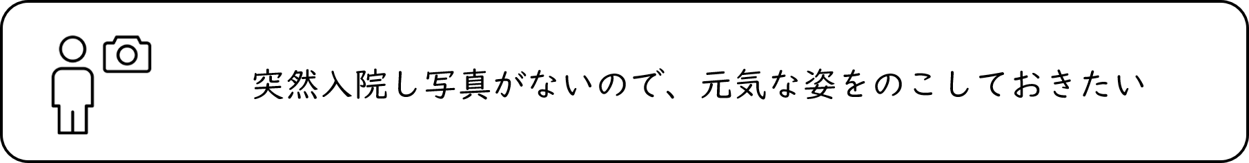 | ●オプションにつきまして ・思い出動画メッセージ作成 ・思い出写真撮影 は、プロのメイク・アーティストがメイクします。 メイク費用込みの料金です。 動画は約3分~10分程度です。 予め伝えたいひとと、メッセージをご用意ください。 ※伝えたいひとは複数人でもOKです ※動画は法律上、正式な遺言には使えません 写真は、遺影に使用できるものや、楽しそうな写真など、30枚程度撮影し、電子データでお譲りします。 |